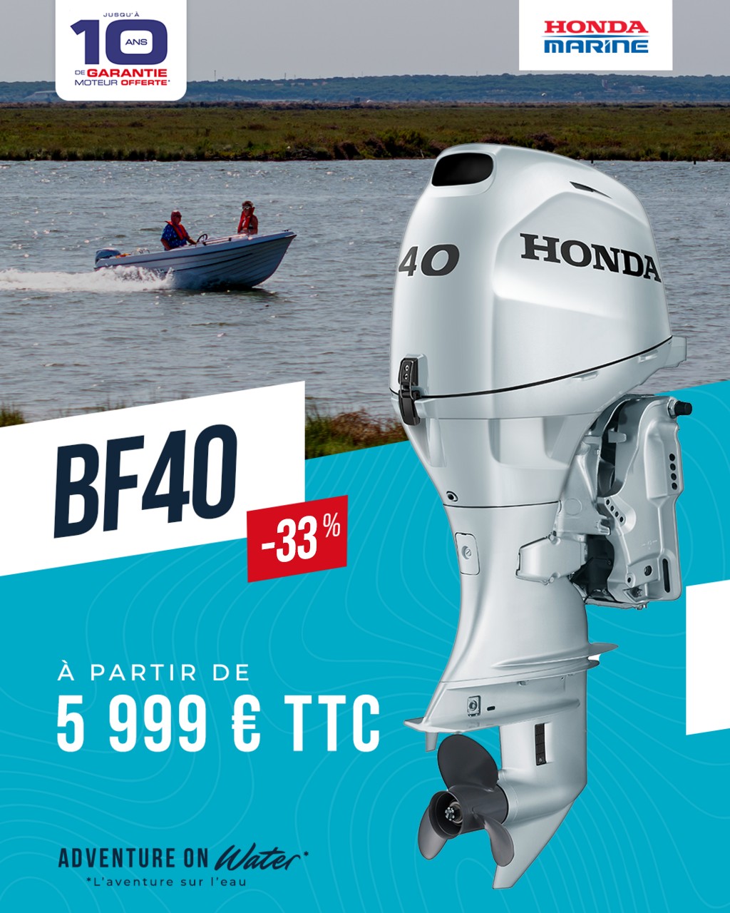Avec Honda Marine, vous bénéficiez de réductions jusqu’à 33% sur une sélection de moteurs hors-bord du BF40 au BF350 :